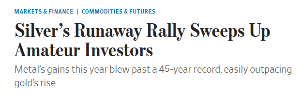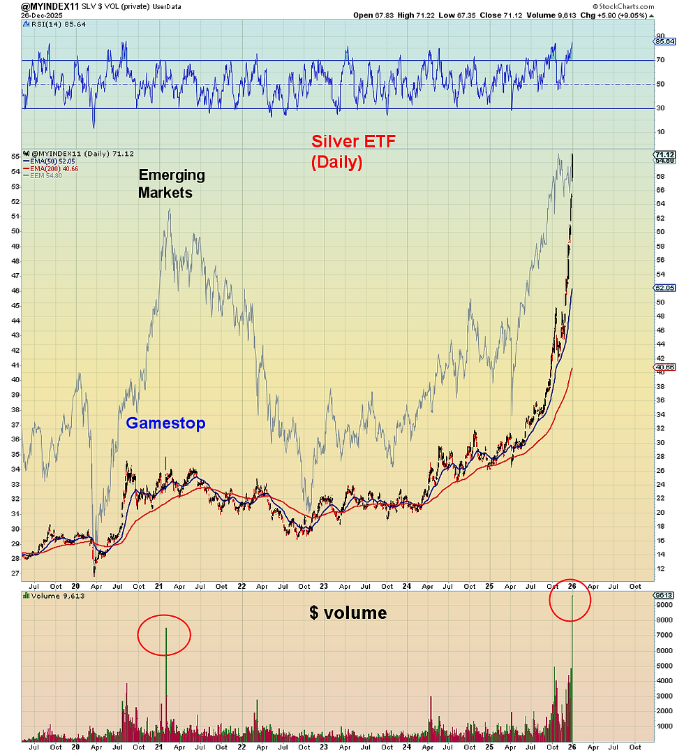 In this chart below I confirmed that Friday had the highest dollar volume (price x volume) in SLV ETF history. And the second highest was February 2021. What we notice however is that this price rise has been far larger than the one day pop back in 2021 which arrived at the END of the Gametop global melt-up. And when the Gamestop speculative frenzy ended, there was a big crash that imploded IPOs/SPACs, Cryptos and Emerging Markets and Ark ETFs.